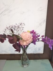 実店舗オープンからはや1週間。お祝いのお花をたくさんいただいたのですが、その中から少しづつ花瓶に生けて店内に飾っております。下記の様な感じです。気持ちよくお仕事ができます!