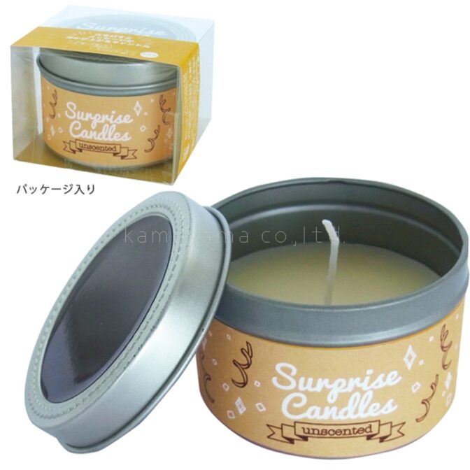 [使い方]①メッセージシール(白)にメッセージを書きます。色鉛筆でもペンでもOk ②フタの真ん中にメッセージシールを貼り、シークレットシール(黒)でメッセージを隠します。③缶を箱に戻し、帯を外して贈ります。シークレットシールがキャンドルの熱で透明になり、メッセージが読めるようになります。